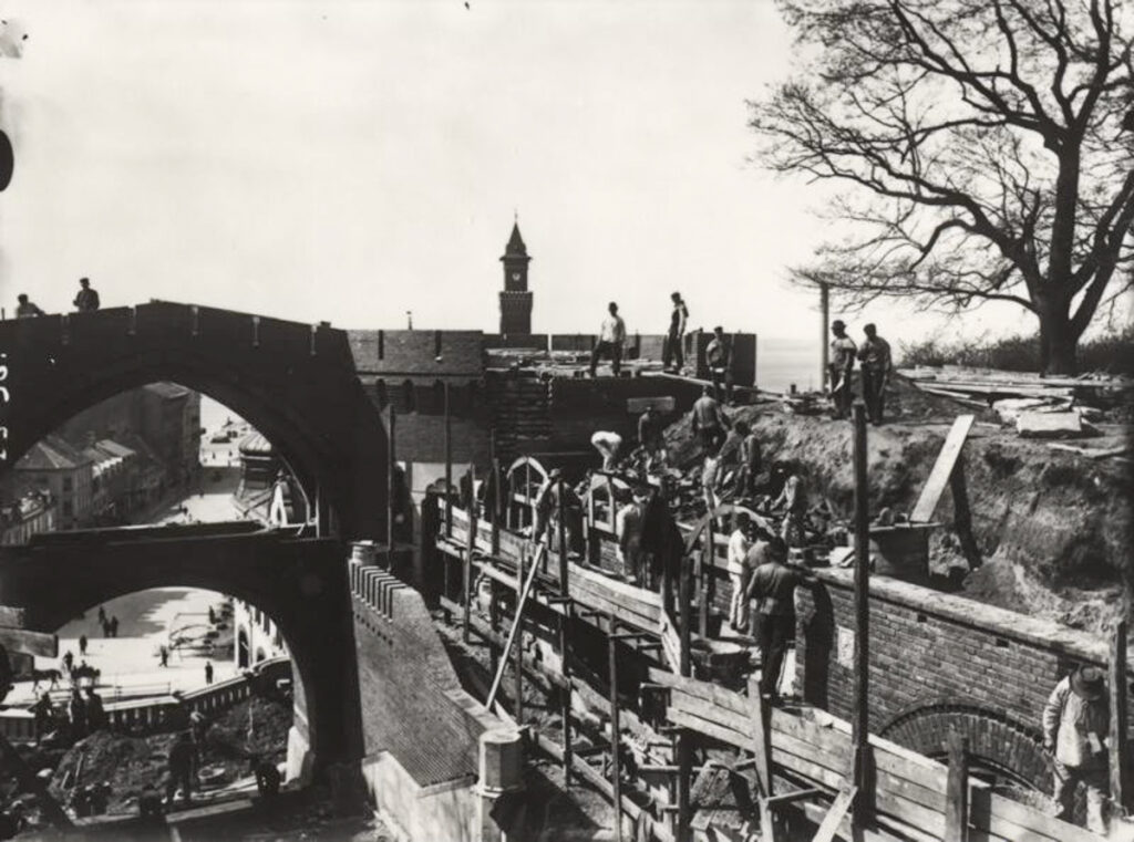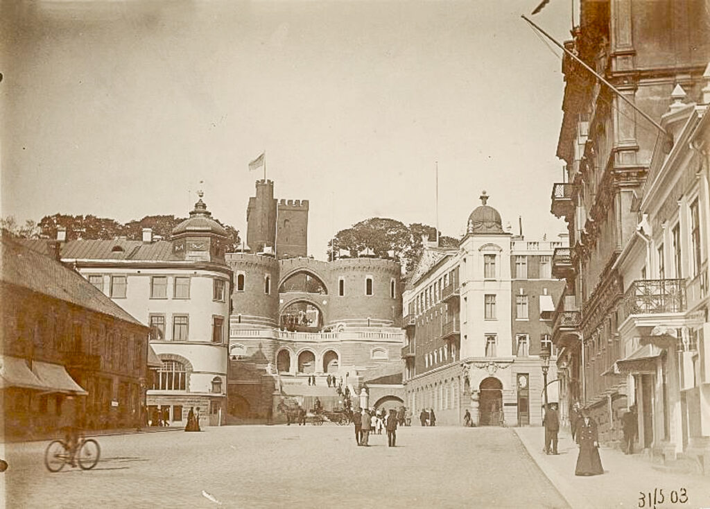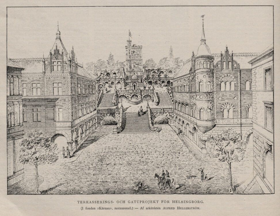 Alfred skriver, jag saxar lite, ”1889 på eftersommaren var Oscar Trapp i Stockholm och förde samman mig med riksantikvarien Hildebrand på restaurang Metropol … varvid jag föreslog att det hus, som då låg där terrassen begynner vid Storgatan, skulle rivas och att uppgång där borde skapas till höjdplatån vid Kärnan. Trapp sade ”skissa här på marmorbordet huru du tänkt dig saken”. Trapp och Hildebrand funno idén tilltalande.”